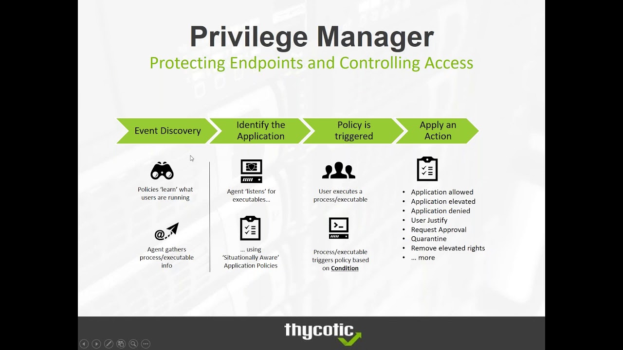 Privilege Manager sử dụng các chính sách dựa trên việc kiểm soát, nâng cấp các ứng dụng người dùng mà không yêu cầu thông tin đăng nhập của quản trị viên hoặc yêu cầu hỗ trợ CNTT. Privilege Manager tự động thêm các ứng dụng đáng tin cậy vào danh sách cho phép, kiểm tra thông tin về mối đe dọa mới nhất từ các công cụ, chẳng hạn như VirusTotal và Blackberry Protect (trước đây là Cylance), tạo danh sách chặn và thêm quy tắc thực thi cho các ứng dụng không xác định trong danh sách hạn chế.